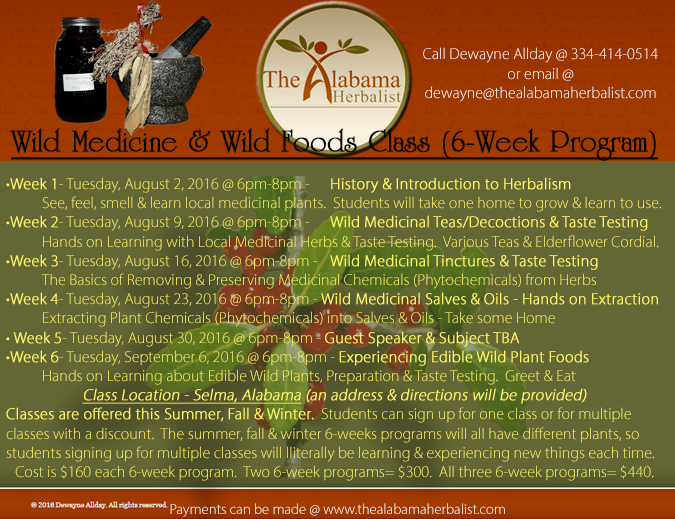 Sign up for one, sign up for two, or sign up for all three. It's not a repetitive kind of class - new seasons bring new plants to learn about and use medicinally. These summer, fall and winter courses will bring you right into the wonderful world of herbalism and give you a taste of some wild edible plants and teas that our ancestors used and others continue to use today. At the begining of the first class, you'll be given a medicinal herb to take home and grow. You'll get hands on knowledge and experience with herbs and get to take some cool things home besides just knowledge such as salves and tinctures. You'll get to see, feeland taste medicinal plants that grow native in our area. You'll also get to see and taste some edible wild foods on "Experiencing Edible Wild Foods" night. Don't miss out. Sign up for just the one Summer program, or sign up for multiple Summer and Winter or all three (Summer, Fall & Winter) 6-weeks classes. These classes are designed to immerse you into the world of using plants for medicine and also to see if you want to stay involved with your herbalism education by becoming a student of the Deep South Center for Herbal Studies which will be taught by Master Herbalist and Naturopath Darryl Patton and myself. If you're interested in one or more of the 6-weeks programs, click on the Paypal Pay Now link on the left and select the option that's right for you.